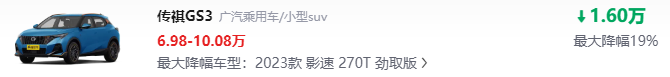 第二臺(tái)車廣汽傳祺GS3,最大降幅比例19%,售價(jià)下調(diào)1.6萬,裸車起步6.98萬,頂配10.08萬。它的外形設(shè)計(jì)更加顯得戰(zhàn)斗,動(dòng)力性能更強(qiáng)一點(diǎn),當(dāng)然售價(jià)也是稍微貴一些。三年保值率在62%左右,去年總銷量賣出5.3萬臺(tái),銷量成績比起長安CS35 PLUS,稍微高一點(diǎn)點(diǎn)。