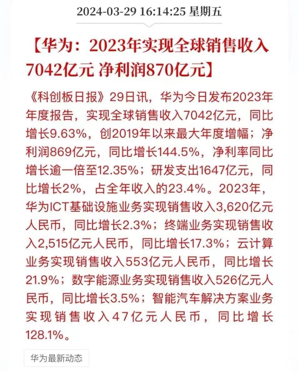 報道,3月29日,華為正式發布2023年度財務報告,實現全球銷售收入7,042億元人民幣,同比增長9.6%,凈利潤870億元人民幣,同比增144%,其中包含出售金融資產(出售榮耀尾款)。