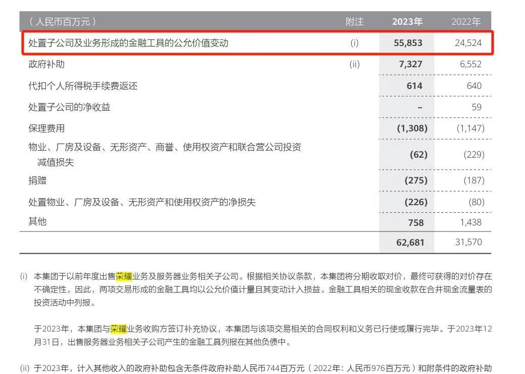 另外,據財報顯示,處置子公司及業務形成的金融工具的公允價值變動金額為550億,簡單講也就是出售榮耀和服務器業務,因此華為實際利潤應為200多億,相較去年同期利潤為356億,華為的獲利能力仍待提高。