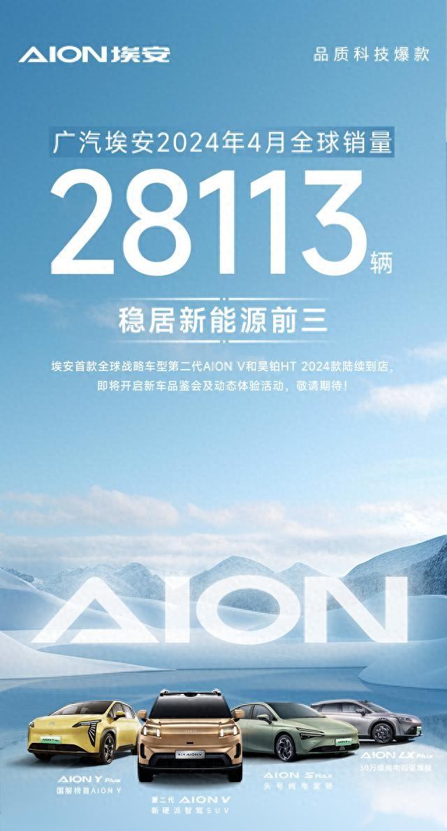 廣汽埃安發布了4月的銷量情況:全球銷量 28113 輛,官方稱穩居新能源前三名。不過這一數據相比前月有所下降,作為對照,其 3 月全球銷量為 32530 輛。