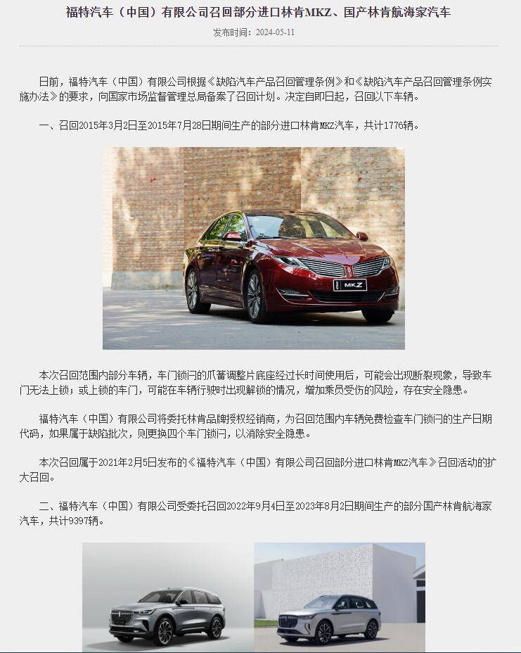 5月11日,國家市場監(jiān)督管理總局缺陷產(chǎn)品召回技術(shù)中心公布了福特汽車的召回計劃,據(jù)悉此次將召回2015年3月2日至2015年7月28日期間生產(chǎn)的部分進口林肯MKZ汽車,共計1776輛。以及2022年9月4日至2023年8月2日期間生產(chǎn)的部分國產(chǎn)林肯航海家汽車,共計9397輛。