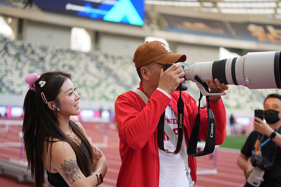 吳艷妮和教練楊輝嘗試使用記者的相機。