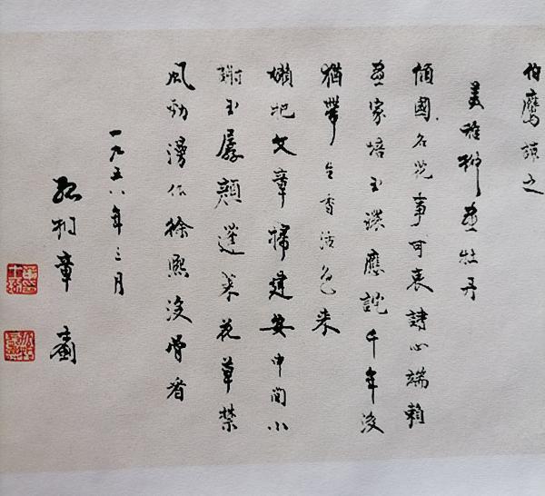 潘伯鷹把謝稚柳畫的牡丹和章士釗的牡丹詩裝裱成卷后,由曹聚仁攜往北京,章士釗又在卷后題了《美稚柳畫牡丹》詩:“傾國名花事可哀,詩心當賴畫家培。玉環應詫千年后,猶帶生香活色來”“嬾把文章掃建安,中間小謝玉潺顏。蓬萊花草禁風勁,漫作徐熙沒骨看。”