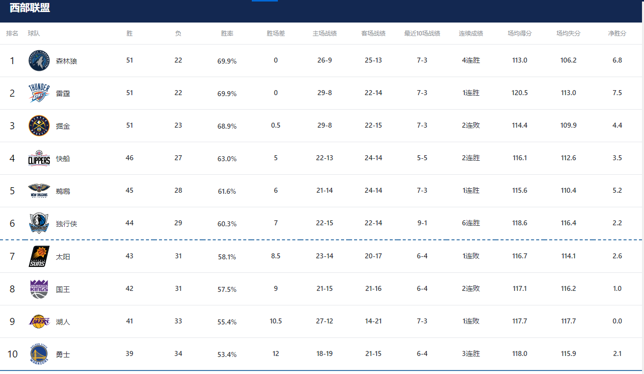 他們落后于三支爭奪前六的球隊——達拉斯獨行俠隊(44勝29負)、菲尼克斯太陽隊(戰績為43勝31負)和薩克拉門托國王隊(戰績為42勝31負)。值得注意的是,湖人落后獨行俠三場,獨行俠目前排名第六。