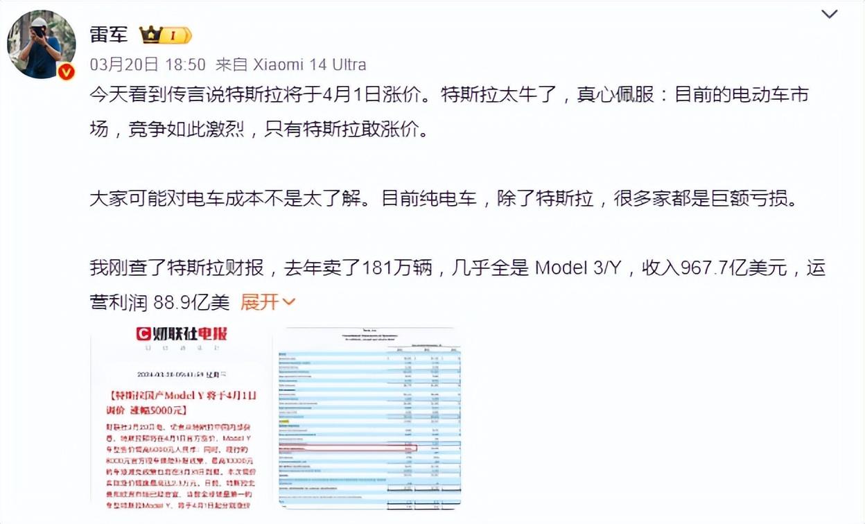 還記得雷軍曾表示:“特斯拉太牛了,真心佩服:目前的電動車市場,競爭如此激烈,只有特斯拉敢漲價。”