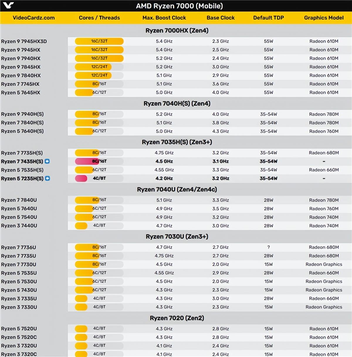 新增加的也是四款,分別是銳龍7 7435H/HS、銳龍5 7235H/HS,相比已有型號(hào)直白地說就是降級(jí)閹割版。