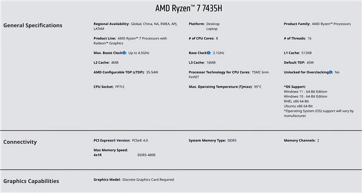 銳龍7 7435H/HS還是8核心16線程、35-54W熱設(shè)計(jì)功耗,核心頻率從3.2-4.75GHz降低到了3.1-4.5GHz,Radeon 680M核顯沒有了。