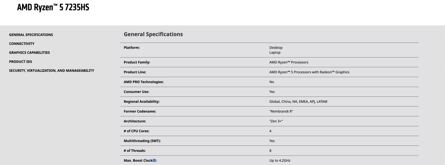 在規格方面,AMD Ryzen 5 7235H APU 采用 4 核 8 線程結構,最高提升頻率為 4.2 GHz,基本頻率為 3.2 GHz。功耗方面,Ryzen 5 7235H 的基本 TDP 為 45W。