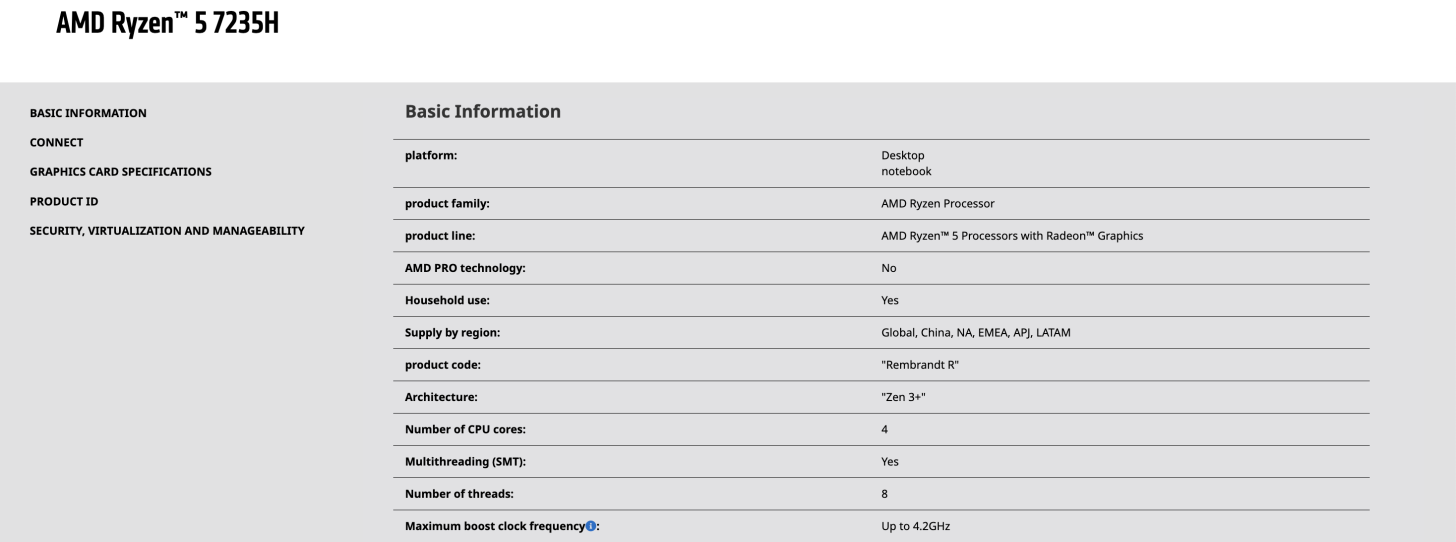 AMD 在其網站上列出了兩款基于代號為 Rembrandt 的 Zen 3+ 核心架構的新 APU:Ryzen 5 7235H 和7235HS。官方尚未公開這兩款新 APU 的發布時間,但 AMD 網站上確實出現了這些 SKU,這表明它們將很快上市。