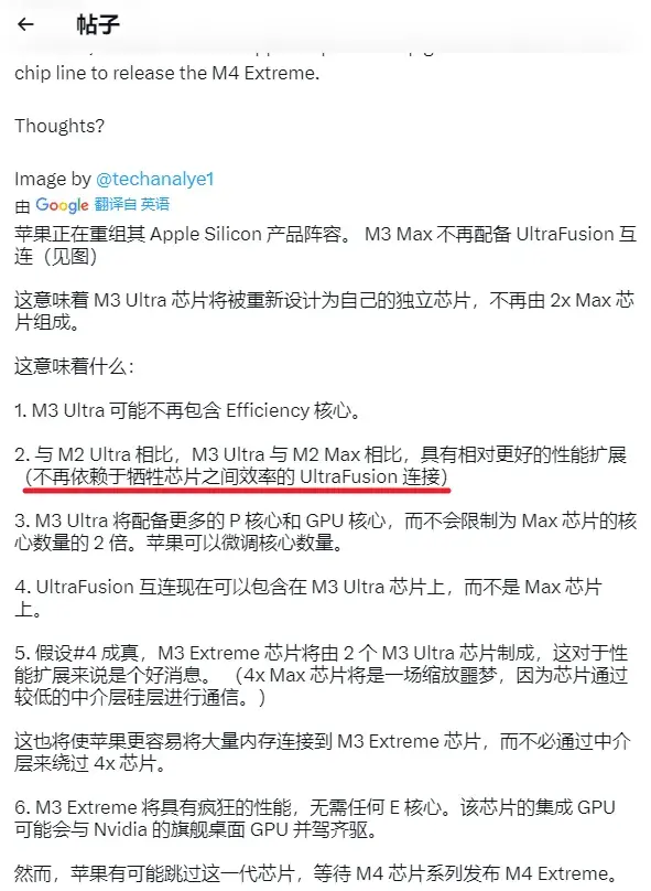 根據 @techanalye1 給出的圖片,M3 Max 似乎去除了該橋接技術,意味著能有更好的性能及擴展性。