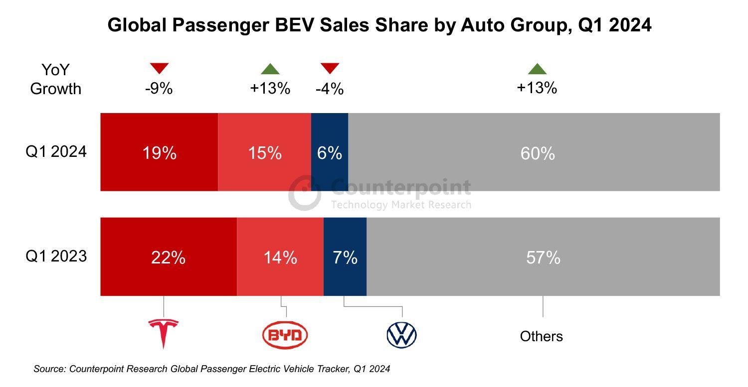 24Q1全球新能源汽車報(bào)告:特斯拉重奪BEV銷冠,比亞迪出口增152%