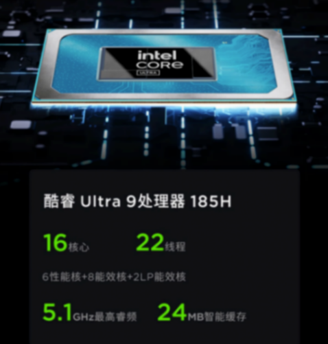 作為該機的最大亮點,酷睿Ultra 9版的聯想小新Pro16 2024自然是集中于處理器方面的升級效果。這顆英特爾酷睿Ultra 9 185H處理器,擁有著16核心22線程的豪華規格,睿頻可達5.1GHz,擁有24MB智能緩存。相對于Ultra 7 155H而言,Ultra 9 185H有著約99.2%的多核性能提升,因此在圖形處理方面也會更有強勁表現。