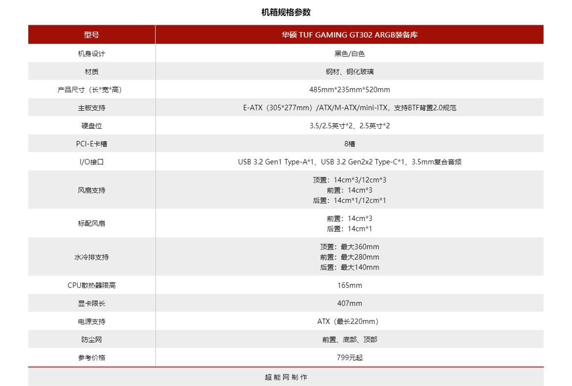 作為華碩TUF GAMING新款中塔機箱,GT302的尺寸還是相對標準的,更符合大家對于機箱的傳統認識,對于不感冒時下流行的“海景房”機箱,就會更為喜歡TUF GT302的樣式了。而最為賣點之一的是,TUF GT302機箱標配有4把14cm的28毫米ARGB風扇,為散熱又為好看,另外在對風扇、水冷排,以及顯卡的安裝支持上,還做到來者不拒,8槽PCI在中塔機箱也屬于少見的一個配置。