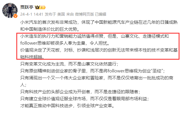 4月1日,Faraday Future創始人賈躍亭在其個人微博也發文為小米汽車的營銷能力點贊。不過,賈躍亭在為小米造車的執行力和營銷能力點贊的同時其還表示,山寨文化、走捷徑模式和follower思維卻被很多人奉為圭臬,令人擔憂。