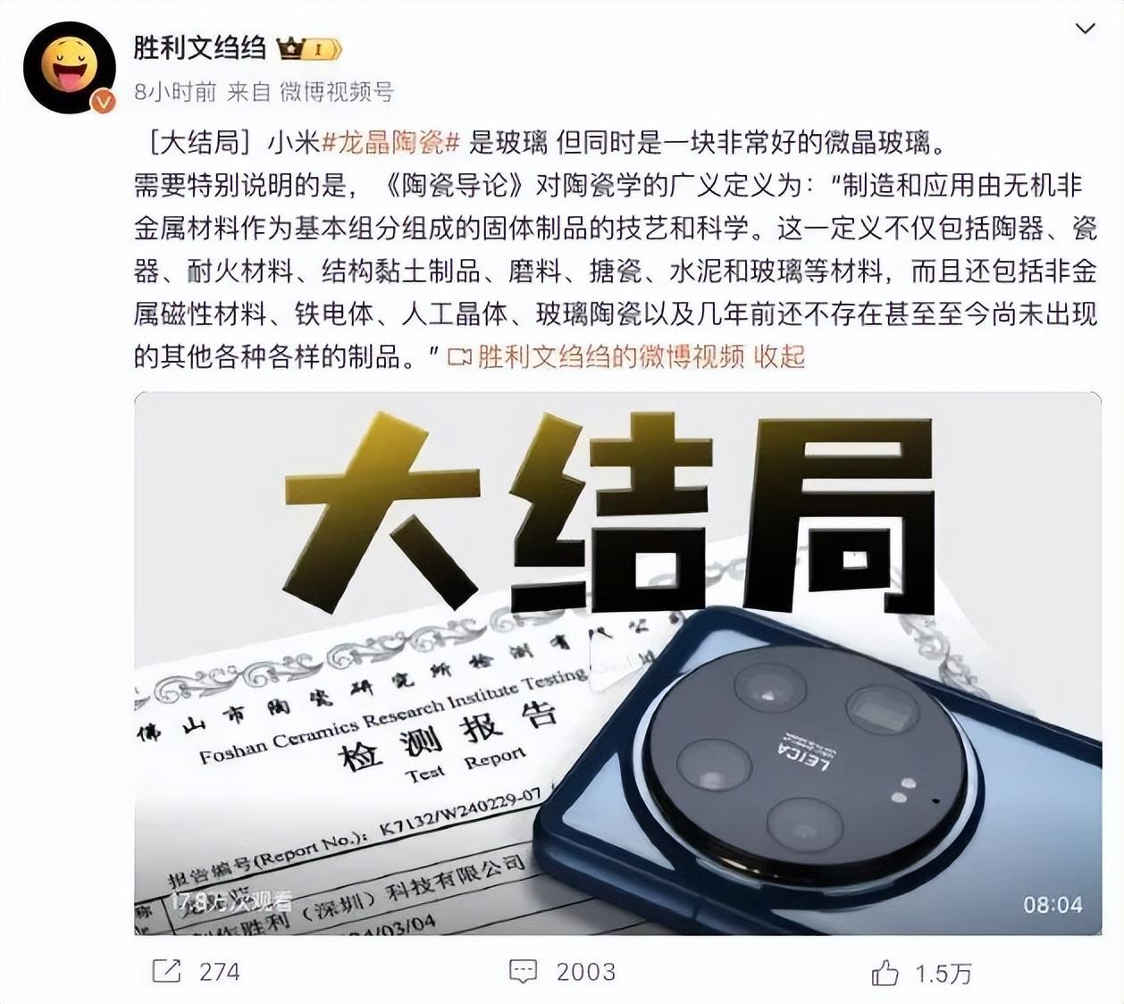至于小米 14 Pro 搭載的龍晶玻璃,在四個月后進一步升級,變成了小米 14 Ultra 搭載的“ 龍晶陶瓷后蓋 ”,惹起不小的爭議,UP 主勝利文縐縐實驗室測試聲稱“ 就是微晶玻璃 ”。