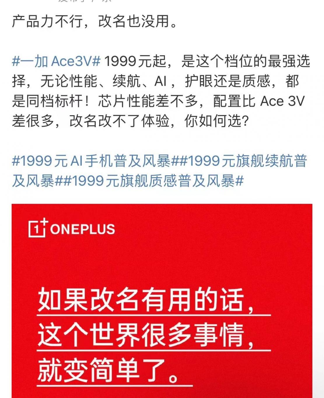 有意思的是,紅米手機剛剛宣布了新十年開局新系列的首款力作Turbo3,一加手機的李杰就在社交平臺上表示“產品力不行,改名也沒用”,同時轉發了最近剛發布的1999元性能相對來說比較強悍的一加Ace3V的海報,疑似暗諷小米新機Turbo3的性能不行。并且李杰還認為一加Ace3V就是這檔位最強產品,其優勢包括性能強,續航長,AI能力足,屏幕的護眼,能力也很強,再加上設計做工和質感,幾乎沒有對手。
