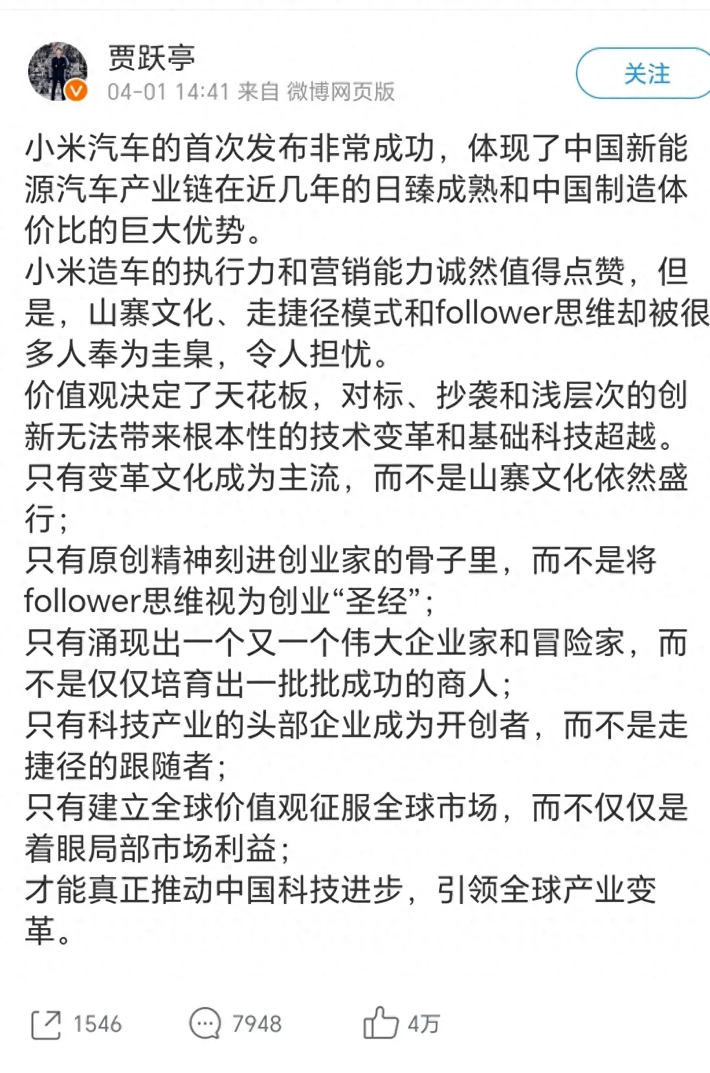 昨天看到,賈躍亭評價小米的創新屬于對標、抄襲、淺層次的創新。