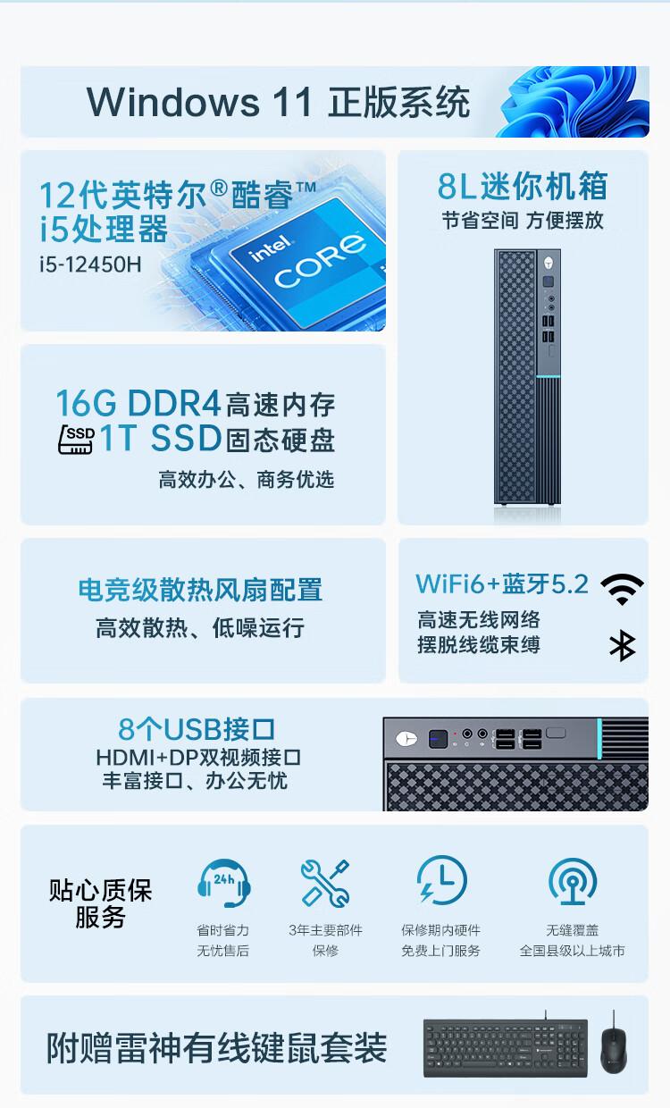 該電腦原裝 16GB DDR4 3200 內存,1TB 固態硬盤與 Wi-Fi 6 無線網卡,180W 電源,預裝正版 Windows 11 操作系統,并附贈雷神鍵鼠套裝。