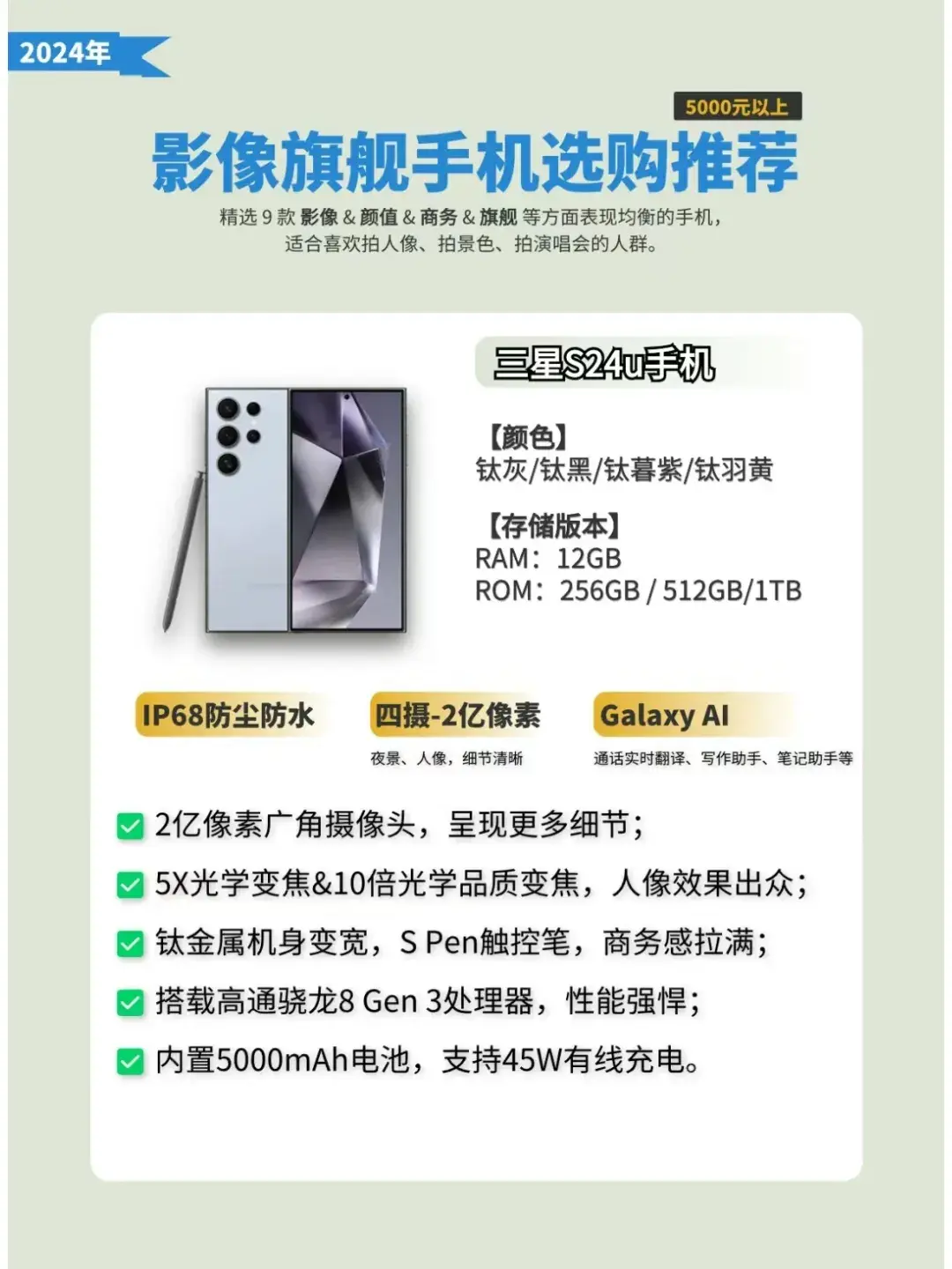 2億像素廣角攝像頭,呈現(xiàn)更多細(xì)節(jié); 5X光學(xué)變焦&10倍光學(xué)品質(zhì)變焦,人像效果出眾; 鈦金屬機(jī)身變寬,S Pen觸控筆,商務(wù)感拉滿(mǎn); 搭載高通驍龍8Gen3處理器,性能強(qiáng)悍; 內(nèi)置5000mAh電池,支持45W有線(xiàn)充電。
