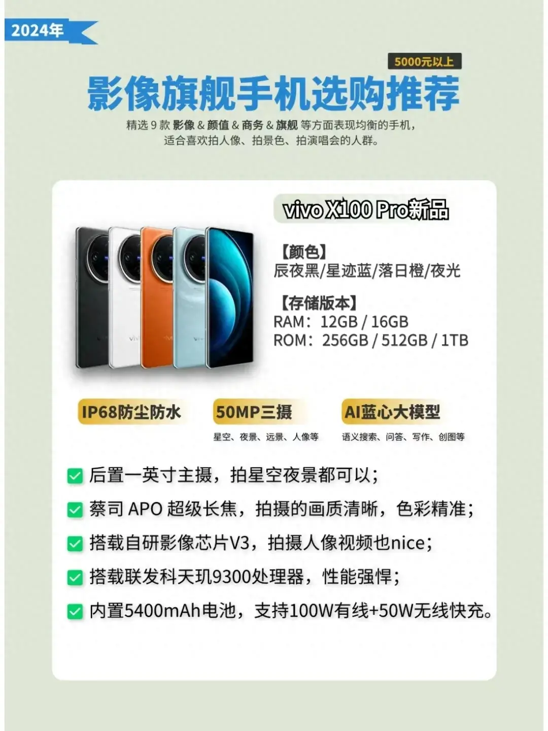 后置一英寸主攝,拍星空夜景都可以; 蔡司APO超級(jí)長(zhǎng)焦,拍攝的畫(huà)質(zhì)清晰,色彩效果好; 搭載自研影像芯片V3,拍攝人像視頻也nice; 搭載聯(lián)發(fā)科天璣9300處理器,性能強(qiáng)悍; 內(nèi)置5400mAh電池,支持100W有線(xiàn)+50W無(wú)線(xiàn)快充。