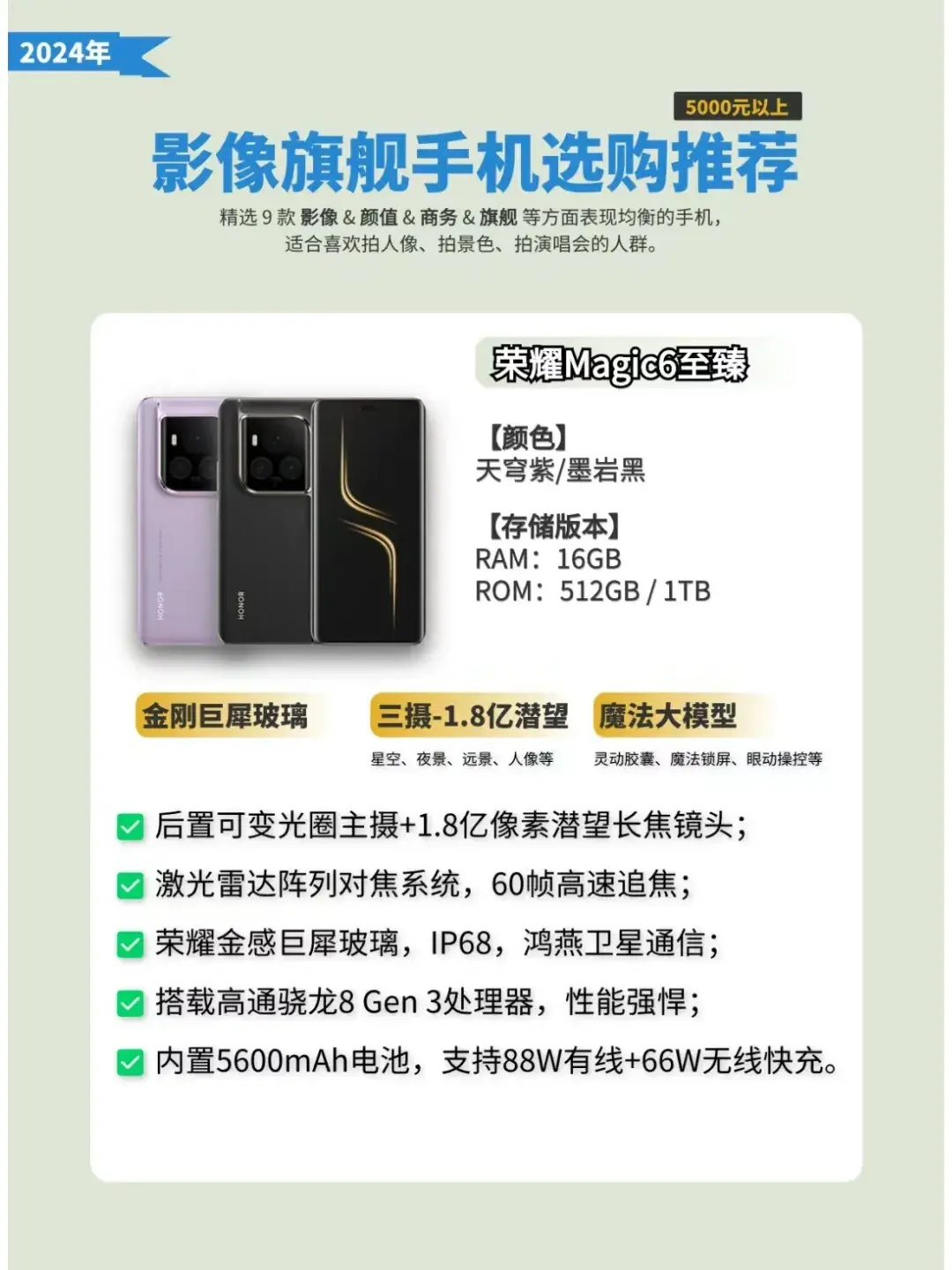 后置可變光圈主攝+1.8億像素潛望長(zhǎng)焦鏡頭: 激光雷達(dá)陣列對(duì)焦系統(tǒng),60幀高速追焦; 榮耀金感巨犀玻璃,IP68,鴻燕衛(wèi)星通信; 搭載高通驍龍8Gen3處理器,性能強(qiáng)悍; 內(nèi)置5600mAh電池,支持88W有線(xiàn)+66W無(wú)線(xiàn)快充。