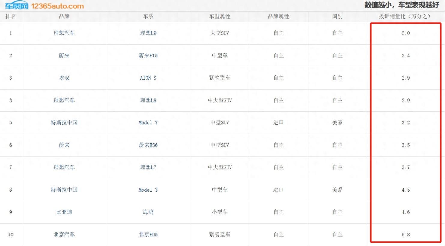 理想L9、L8和L7萬輛投訴量比分別為2、2.9和3.7,分列第一、第三和第七,也是榜單當中品牌總體表現較好的新勢力,所以理想汽車雖然因為冰箱彩電沙發而經常被吐槽,但論品控還是信得過的;蔚來ET5、ES6萬輛投訴量比分別為2.4和3.5,分列第二和第六,同樣表現出色。