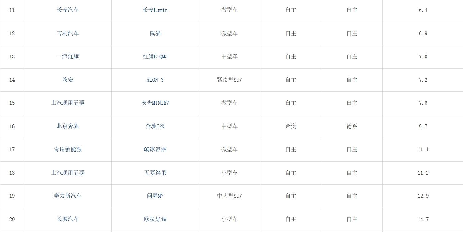 這個區域我們看到了微型電動車的身影,其中長安Lumin、吉利熊貓、宏光MINIEV、QQ冰淇淋的投訴量比分別為6.4、6.9、7.6和11.1,分列第十一、十二、十五和十七名,總感覺投訴量有點高,是否說明低端電動車的品控還有較大提升空間。
