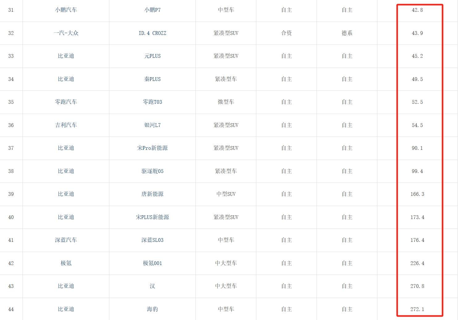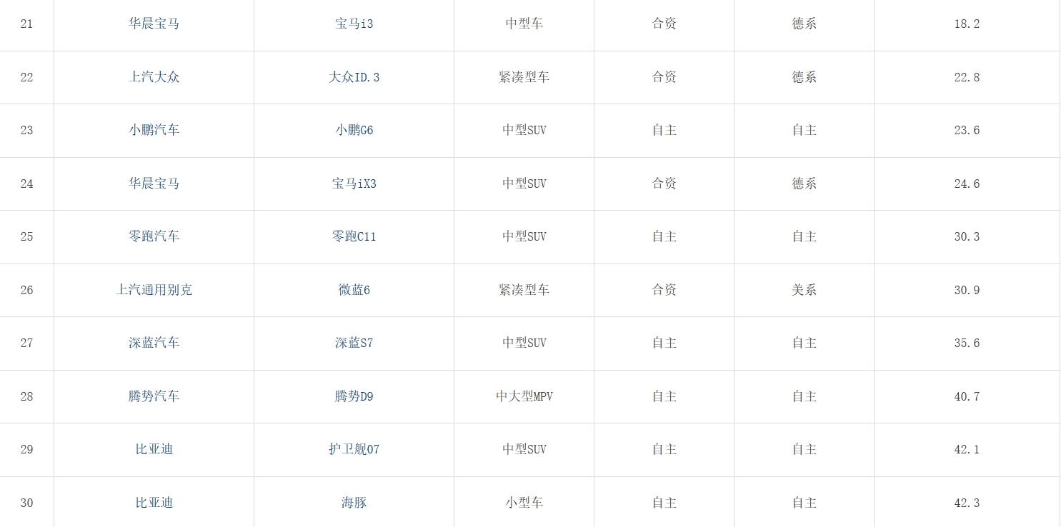 小鵬G6、零跑C11、深藍S7、騰勢D9和比亞迪護衛艦07、海豚也出現在該排名區域,但小鵬距離理想和蔚來還差的比較遠,騰勢D9則是僅有的一款中大型MPV,表現不錯,而比亞迪海豚與海鷗差距同樣很大。