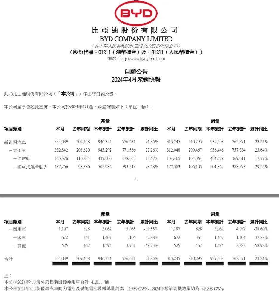 比亞迪是目前全球新能源汽車銷量的領(lǐng)頭羊,2024年4月,比亞迪新車銷量313245輛,乘用車銷售312048輛,同比增長(zhǎng)49%,比亞迪品牌王朝丨海洋297864輛,騰勢(shì)汽車11122輛,仰望汽車952輛,方程豹2110輛。其中,比亞迪集團(tuán)4月乘用車出口41011輛,同比增長(zhǎng)176.6%。可以看出,比亞迪在狂“卷”的2024還是保持了持續(xù)增長(zhǎng)的勢(shì)頭。