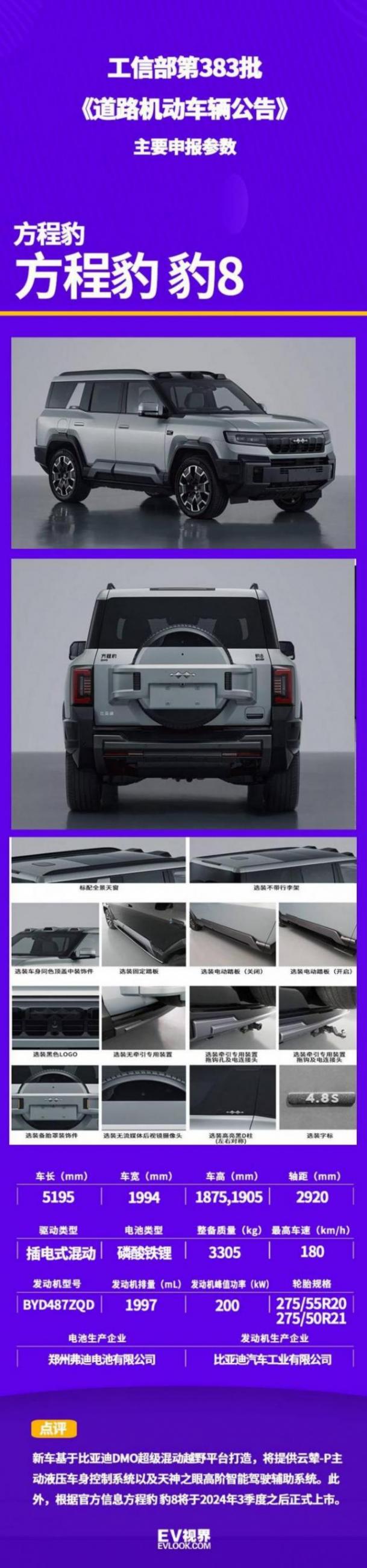 工信部公示第383批《道路機動車輛生產企業及產品公告》,其中方程豹 豹8在列。新車基于DMO超級混動越野平臺,搭載2.0T高功率發動機與前后雙電機組成的插電式混動系統,配備云輦-P主動液壓車身控制系統及天神之眼高階智能駕駛輔助系統,未來將支持城市與高速NOA。根據此前報道,該車未來定價或在50萬區間,預計在三季度上市。