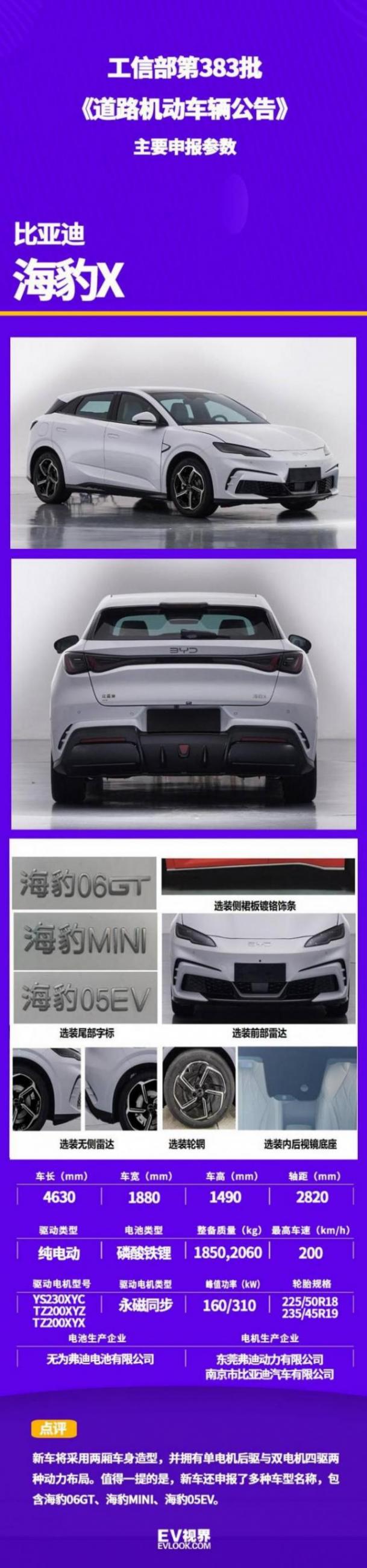 工信部公示第383批《道路機動車輛生產企業及產品公告》,其中比亞迪海洋網全新純電動轎車在列。新車將采用兩廂車身造型,并擁有單電機后驅與雙電機四驅兩種動力布局。根據尾標來看,新車正式命名尚未確定,選項分別有海豹06 GT、海豹MINI、海豹05 EV以及海豹X,其中海豹X已經出現在了尾門處,預計大概率將會使用該命名。