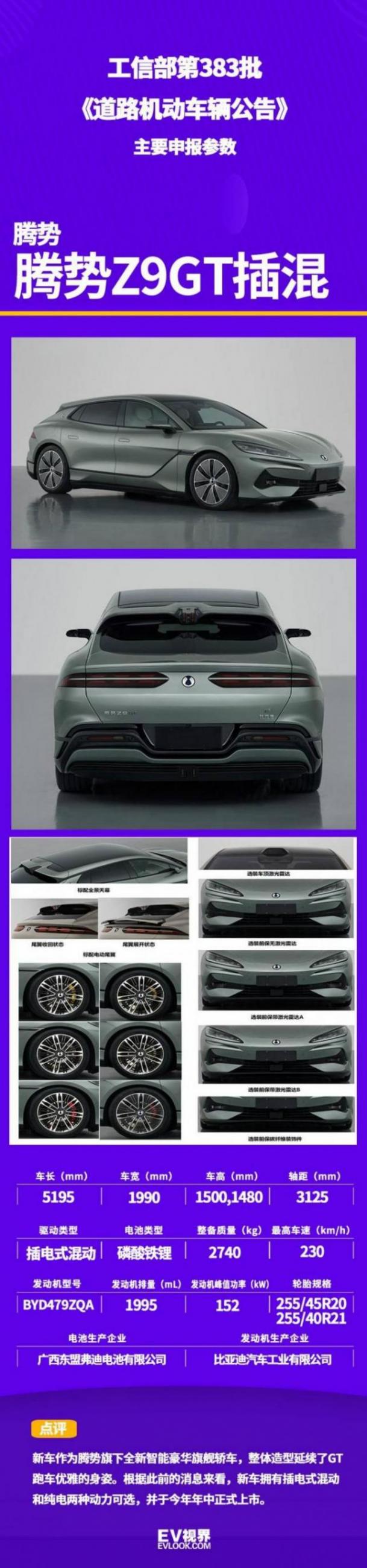 工信部公示第383批《道路機動車輛生產企業及產品公告》,其中騰勢Z9GT插混版在列。新車作為騰勢旗下全新智能豪華旗艦轎車,整體造型延續了GT跑車優雅的身姿。根據此前的消息來看,新車擁有插電式混動和純電兩種動力可選,并于今年年中正式上市。