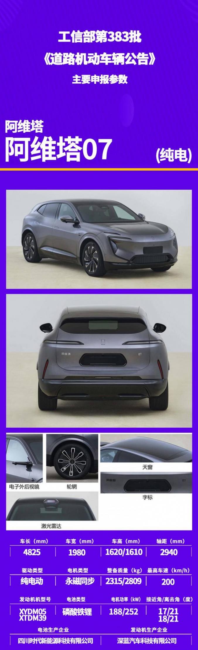 工信部公示第383批《道路機動車輛生產企業及產品公告》,其中阿維塔07在列其中。據悉,新車主打大五座布局的中型SUV,并且提供純電和增程兩種動力形式。