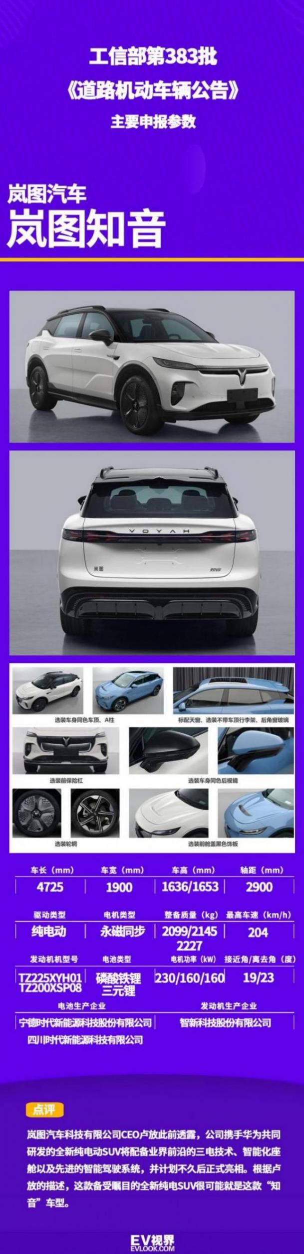 工信部公示第383批《道路機動車輛生產企業及產品公告》,其中嵐圖全新純電動SUV車型在列其中。據悉,新車在公司內部曾以H37為代號,而根據其尾標信息,預計在正式推向市場時可能被命名為“嵐圖知音”。根據先前的報道,這款新車的市場定位將低于現有的嵐圖FREE車型,定位為中型SUV,旨在成為品牌家族中的入門級產品。