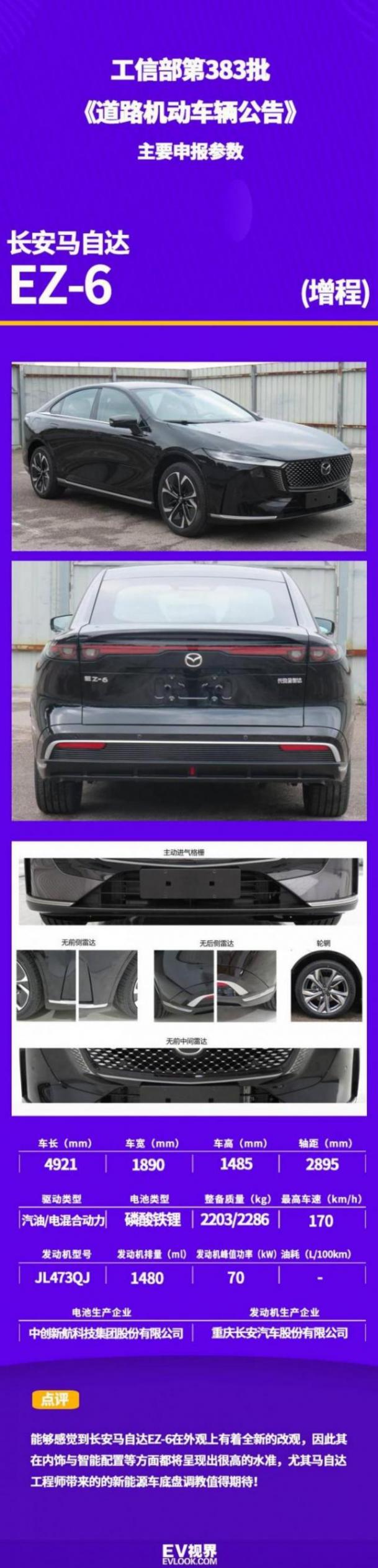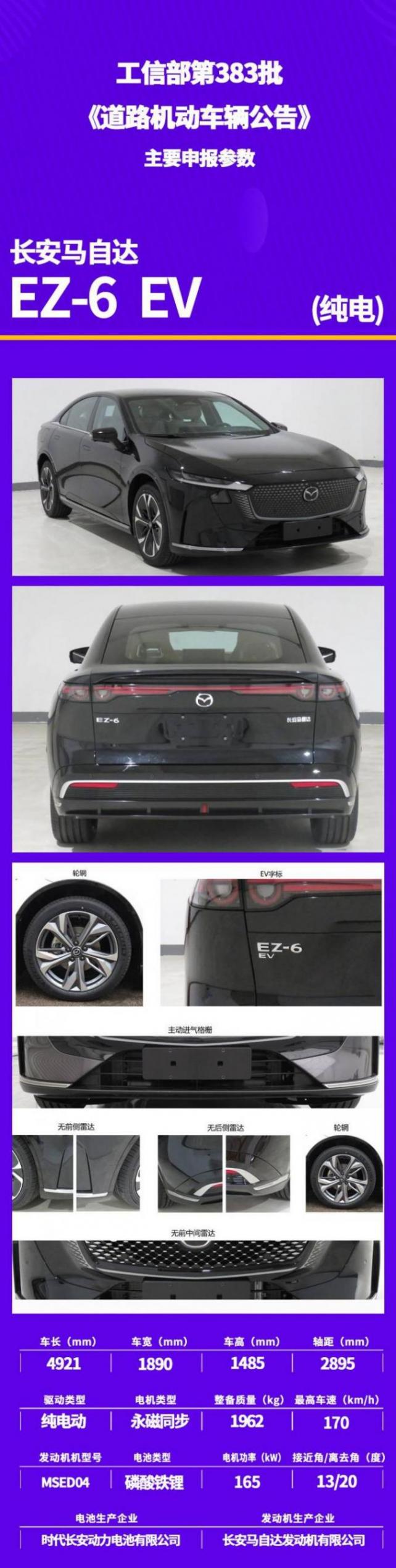 工信部公示第383批《道路機動車輛生產企業及產品公告》,其中馬自達EZ-6。據悉,新車定位為中型轎車,由馬自達與長安汽車聯合研發,采用長安EPA混合動力平臺,支持純電動和增程式驅動系統。