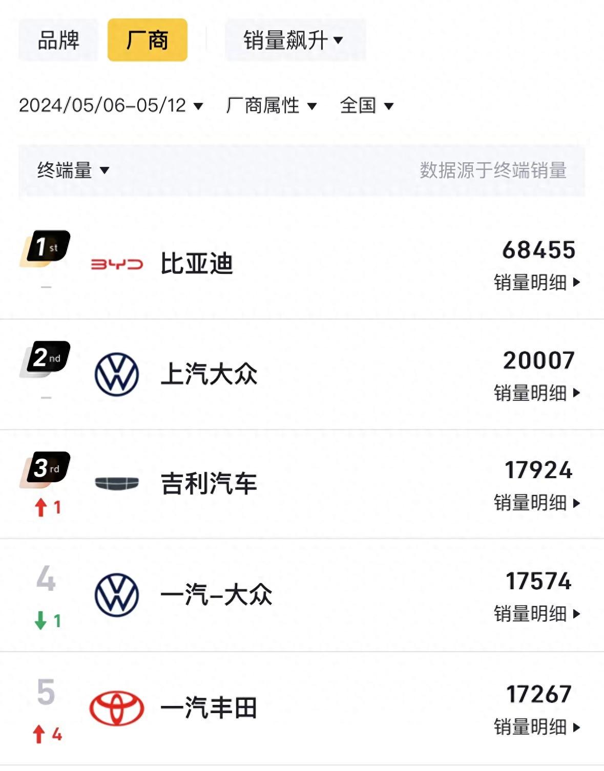 第2周,上汽大眾排名乘用車廠商第2,周銷量成績?yōu)?0007輛。也就是說,比亞迪的銷量幾乎達到了第二強的三倍之多。細究比亞迪增長的背后,與多款明星車型在五一小長假期間積累的訂單,加速在第2周交付轉化有關。