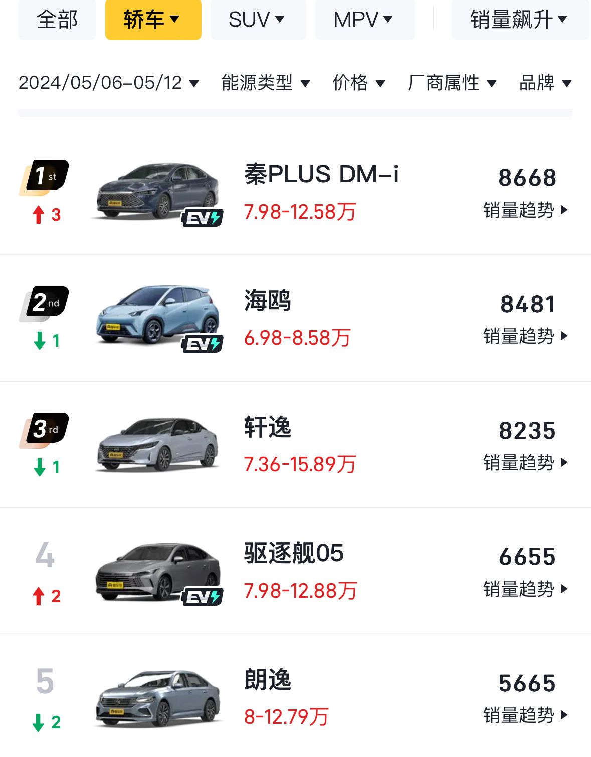 從具體的細分市場來看,各市場的內部排名也出現(xiàn)了一些細微的變化。在轎車市場上,比亞迪秦PLUS DM-i就憑借8668輛的成績,重新奪回了轎車市場銷量冠軍,海鷗緊隨其后。驅逐艦05、秦PLUS EV不僅排名迎來了提升,而且兩款車型均創(chuàng)下了今年以來的周銷量最高記錄,分別取得了6655輛和5422輛的成績。