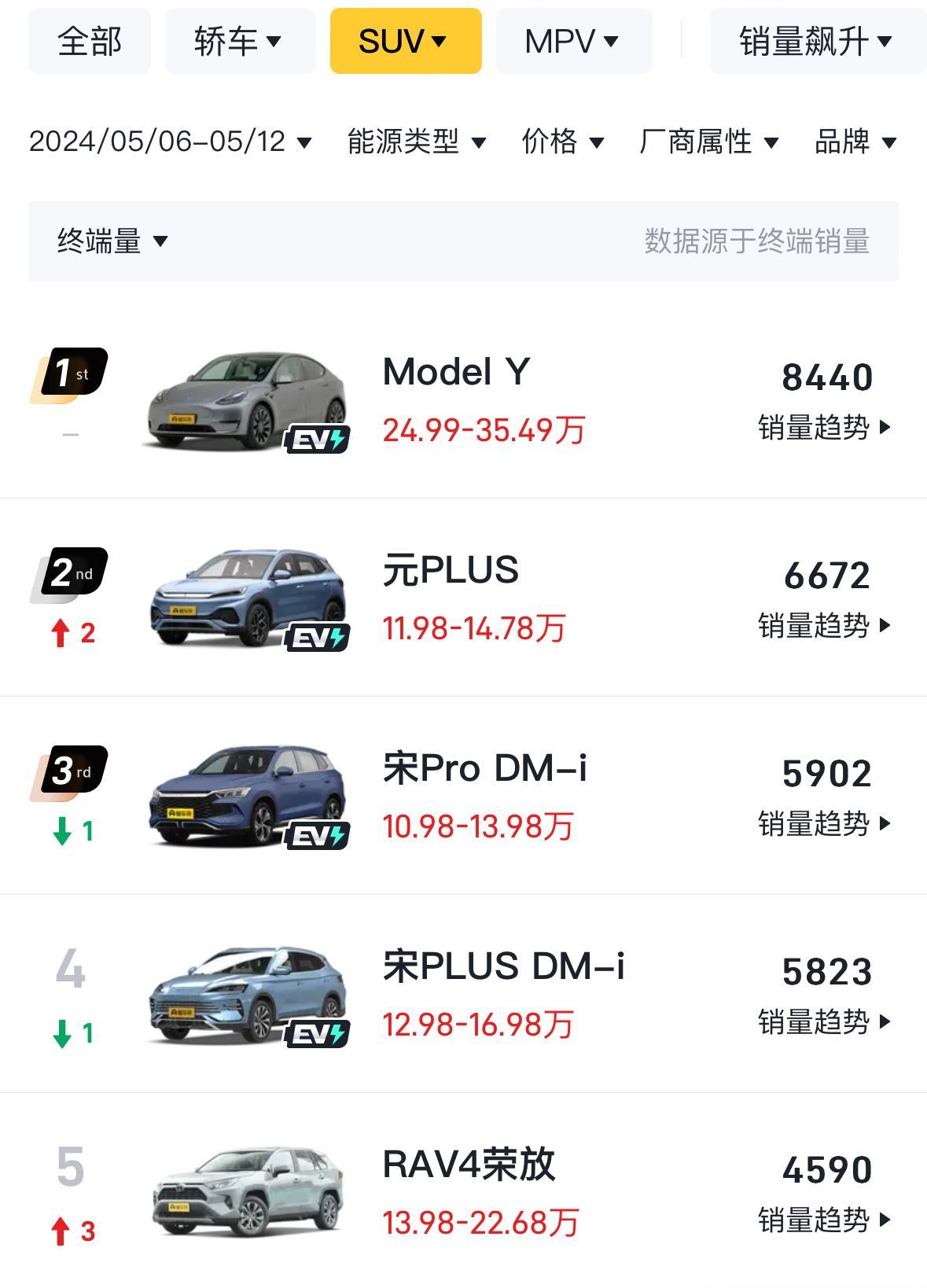 SUV市場上,“合資強,自主弱”的局面稍微有所緩解。在特斯拉Model Y仍然牢牢掌握著銷冠寶座的基礎上,除了元PLUS、宋Pro DM-i、宋PLUS DM-i,AION Y等自主新能源,吉利星越L仍然是榜單中的常見面孔,5月第2周取得了3766輛的成績。