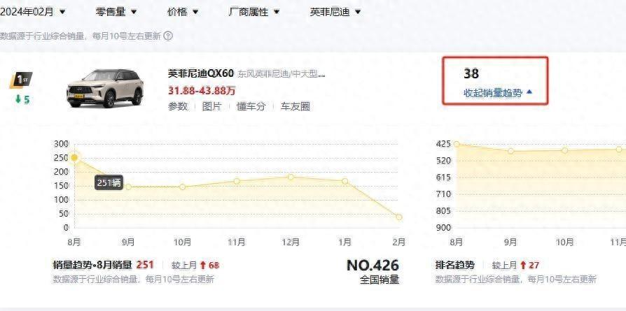 這些年,豪華品牌在國內的市場占有率日漸式微,不少二線豪華品牌的車型為了鞏固市場地位,不得已只好下放價格來爭奪市場。英菲尼迪QX60就是一個好例子,作為日產高端品牌旗下的主力車型,定位中大型SUV,指導價37.88-51.88萬元,2024年2月僅售出38輛,這份成績對比2023年8月份的月銷數據(251輛),市場銷量下滑明顯。