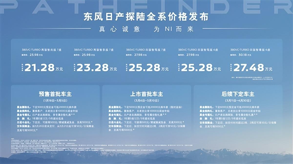 日產探陸在3月6日上市,共推出五款車型,售價23.98-30.18萬,官方還推出了限時誠意價,售價區間為21.28-27.48萬元,在合資中大型SUV里是非常香的價格了。