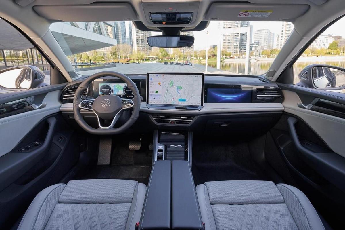 從座艙之內來看,因為我們已經看到了大量ID.純電動系列產品與不少迭代車型,所以大眾在座艙內的風格變化并不會像外觀帶給我們的那么震撼。中控臺產生了顯著的重心偏轉,它會為車輛帶來更便捷的中控操作,其中,中控屏預計會與ID.7 VIZZION采用同規打造,無論是15.0英寸的尺寸規格,還是下方貼合的固定觸控條,都呈現出了一種數字化升級。更重要的是,除了方向盤前端嵌入式全液晶儀表盤外,副駕駛裝飾擋板下也嵌入了一塊獨立娛樂觸控屏,配合三輻式觸控方向盤+電子懷擋,整個座艙的智能升級都是肉眼可見的。