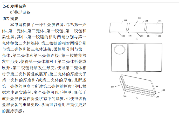 根據國家知識產權局公開的相關專利申請,華為這折疊屏設備有三個殼體,可以不等厚度,使設備重量更輕,握持手感也更好。