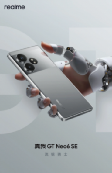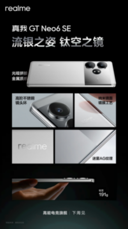 目前真我官方已經開始預熱GT Neo6SE,公布了該機的部分外觀,其中有「流銀騎士」配色版本,宣傳語是:與生俱來的科技感,更多驚喜,下周見!