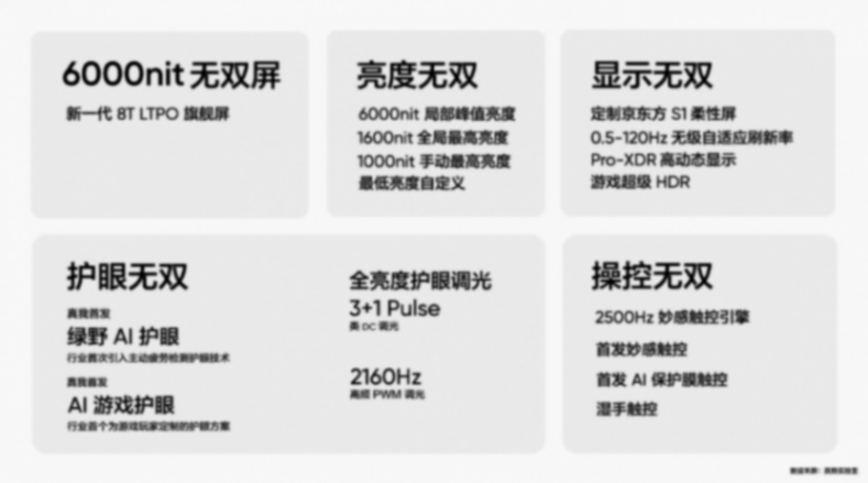 新一代8T LTPO技術比目前主流手機使用的會更好,可以做到0.5-120Hz無級自適應刷新率,相比一般LTPS屏幕功耗至高降低20%。其他還綠野AI護眼、2500Hz妙感操控等技術,這屏幕是同價位最強吧?