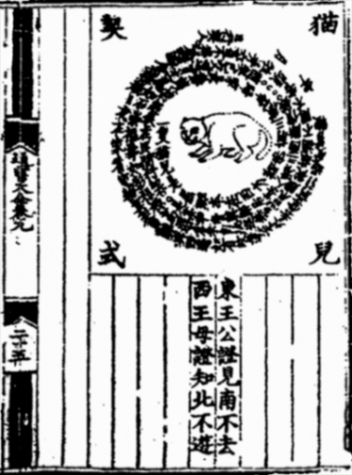 關于道教,貓、煉丹與鶴三者相結合,鶴與煉丹通常作為道教象征。如“蘇子由曾試黃白之法,既舉火,見一大貓據(jù)爐而溺,叱之不見,丹終不成”。《乘異記》中,“許遨市藥造爐,使其人自守而候之。將成,必有貓觸,其爐破,雙鶴飛去”?!肚瀹愪洝酚涊d:“居士李巍,求道雪竇山中,畦蔬自供。有問巍曰:‘日進何味?’答曰:‘煉鶴一羹,醉貓三瓶’。”于此,貓、鶴與煉丹并置共融,彰顯出修行者對純潔、自然、無欲無求境界的向往,淋漓盡致地展現(xiàn)了修行者超脫塵世、淡泊名利的品格風貌。此外,納貓的“貓兒契式”或許借鑒了道教“契”的神異色彩,將道士用來請神兵鬼將的兵符社契融入民俗,寓意請貓兵驅(qū)鼠患。(郭心葉《神祇·祥瑞·妖魅:中國古代筆記與小說中的貓故事研究》)