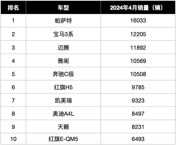 合資車方面,帕薩特、邁騰位居冠軍和季軍,4月分別賣出16033輛和11892輛;雅閣、凱美瑞、天籟也比較吃香,分別排名第四、第七和第九。