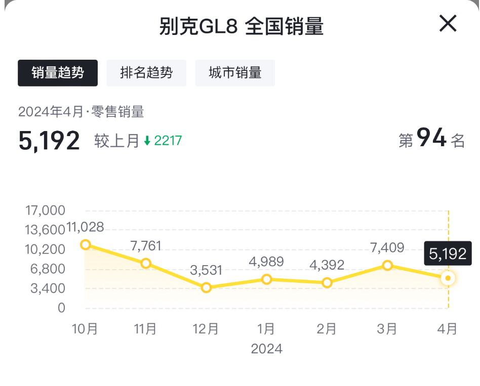 所以,如今2024年4月份,別克GL8的單月零售銷量僅為5000余臺(tái),我認(rèn)為這值得別克方面警惕。