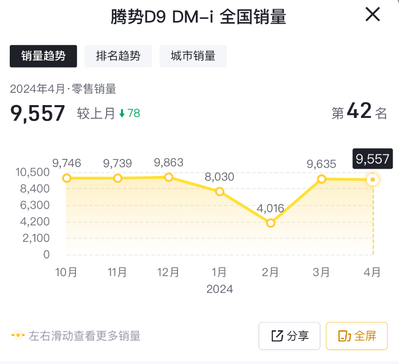 至于騰勢(shì)D9的銷量,則更是超過了同期別克GL8的銷量成績。行業(yè)綜合銷量數(shù)據(jù)顯示,2024年1-4月份,騰勢(shì)D9 DM-i的單月零售銷量為8030臺(tái)、4016臺(tái)、9635臺(tái)、9557臺(tái)。