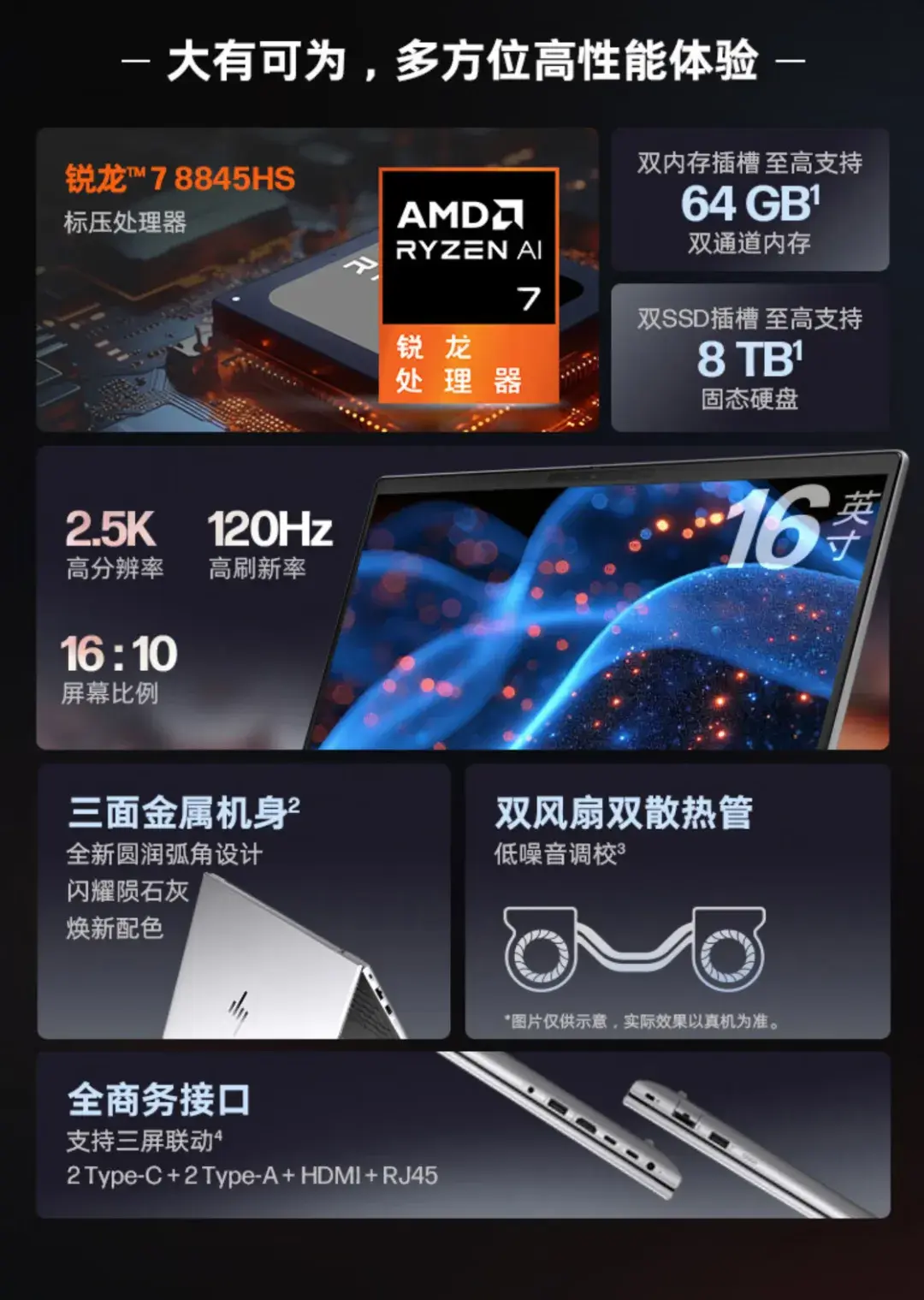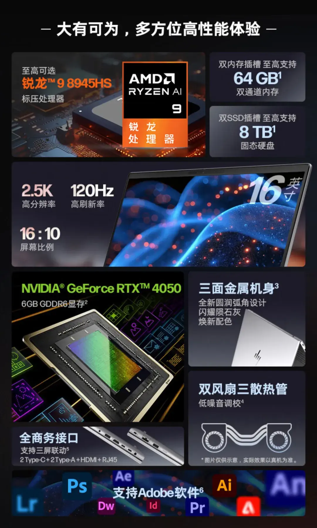 消費級獨顯版則是在32GB核顯版的基礎上,新增了RTX 4050獨顯,散熱方面也隨之升級雙風扇三熱管,可以帶來秒殺CPU內NPU的AI算力,還能在更多專業生產力應用中起到加速效果,偶爾玩玩游戲也是很好的。但是,3D性能增強也是需要代價的,首發價7299元,上漲了2000大元。獨顯版首發型號搭載銳龍7 8845HS處理器,但宣傳圖顯示的卻是銳龍9 8945HS,可見該產品后續還會有銳龍9的子型號更新。