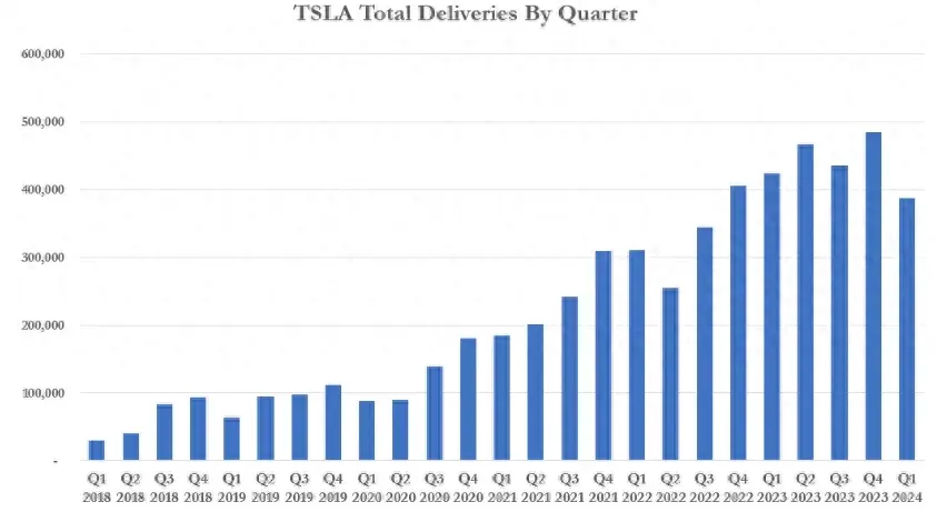 剛剛,特斯拉發(fā)布了 2024 年第一季度的產(chǎn)銷數(shù)據(jù):總計交付 386,810 輛汽車。
